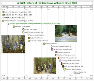 In 2011 the overall commitment became a bit much for the Sandy Hook Community Association that had other obligations too. Also it was seen as advantageous to not only have a dedicated Society but one that could apply for Charitable status with the ability to issue tax receipts. March 8, 2011 the Sechelt Groves Society was formed using some seed money from the SHCA and including some SHCA board members on the new Society board.